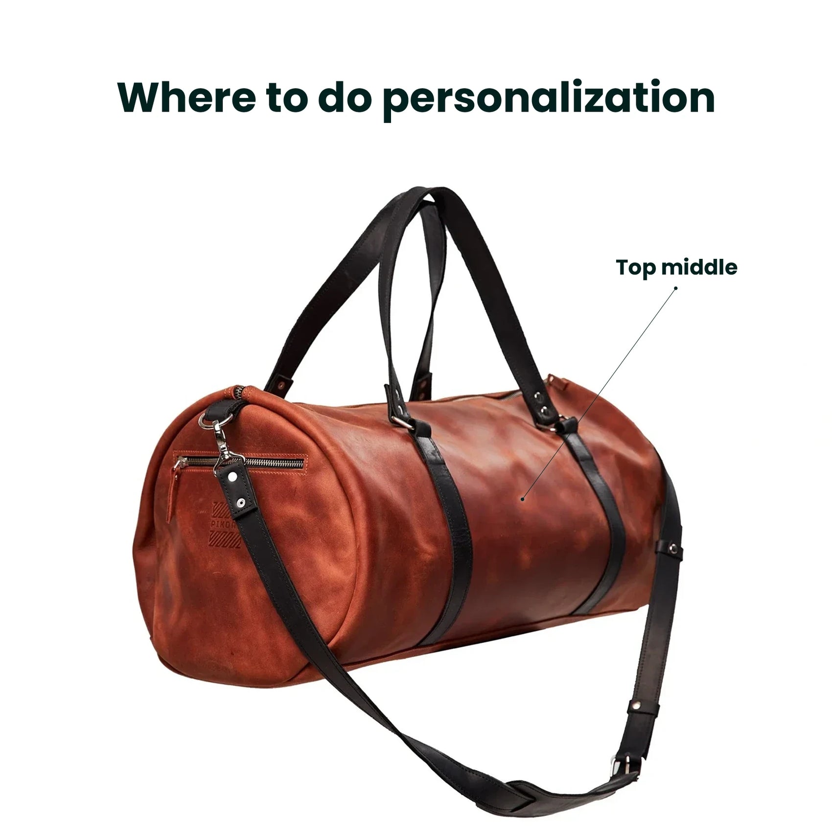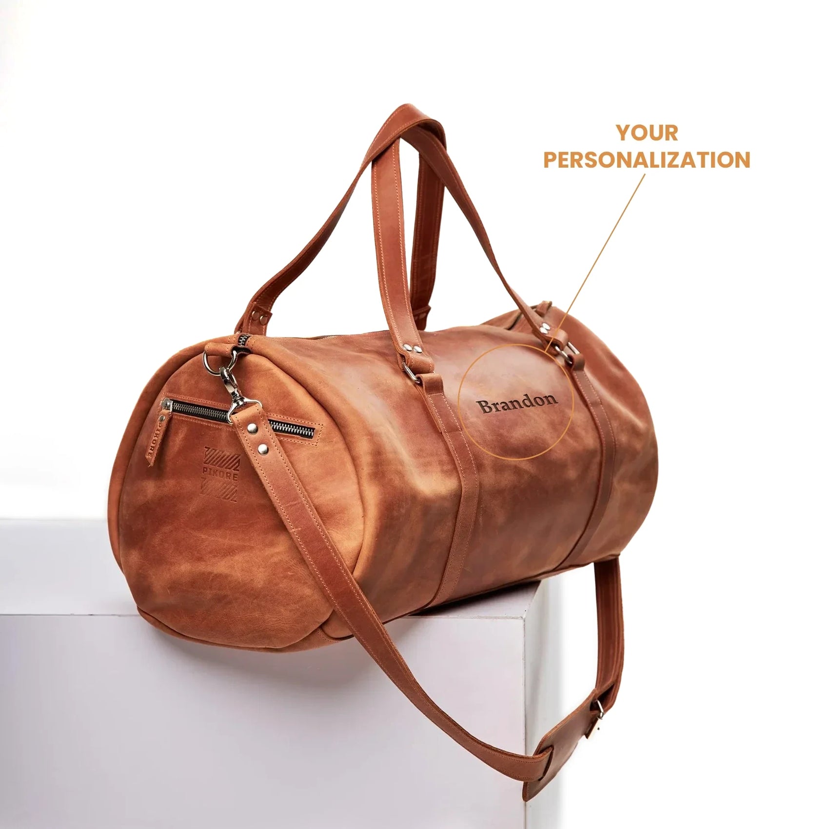 Crafted from full grain leather, this duffle bag is made to withstand the rigors of travel. No special maintenance required.