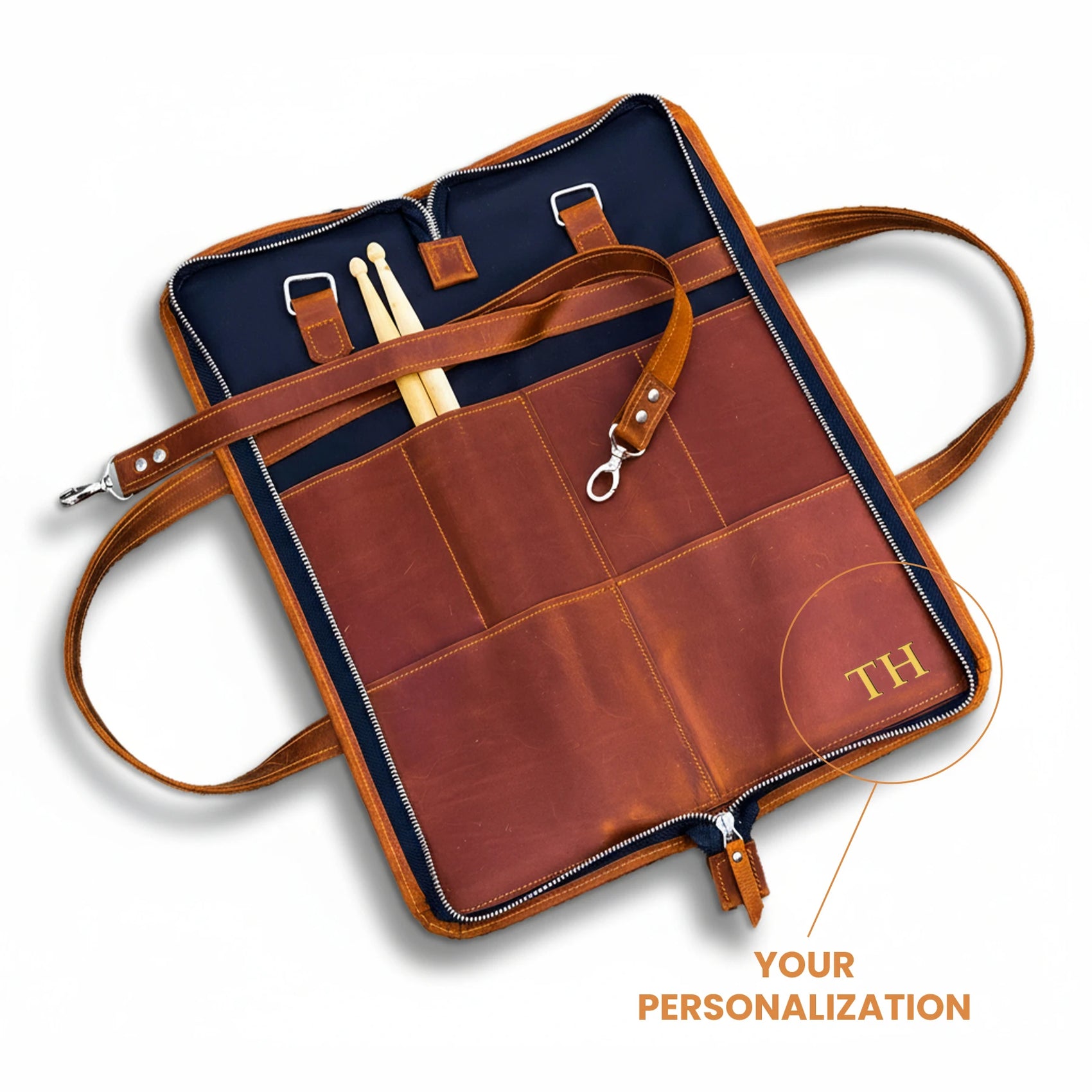Handcrafted for drummers, this genuine leather drumstick bag keeps your sticks protected and organized in style. With secure zippered storage and a convenient carrying strap, it's the perfect accessory.