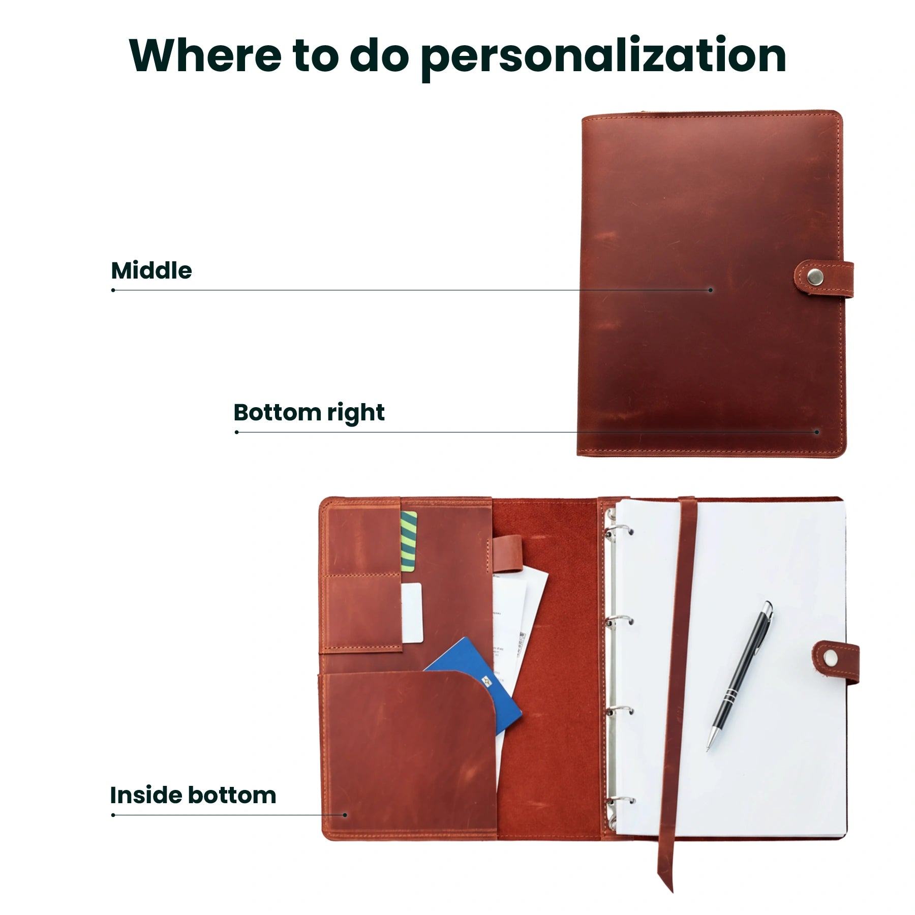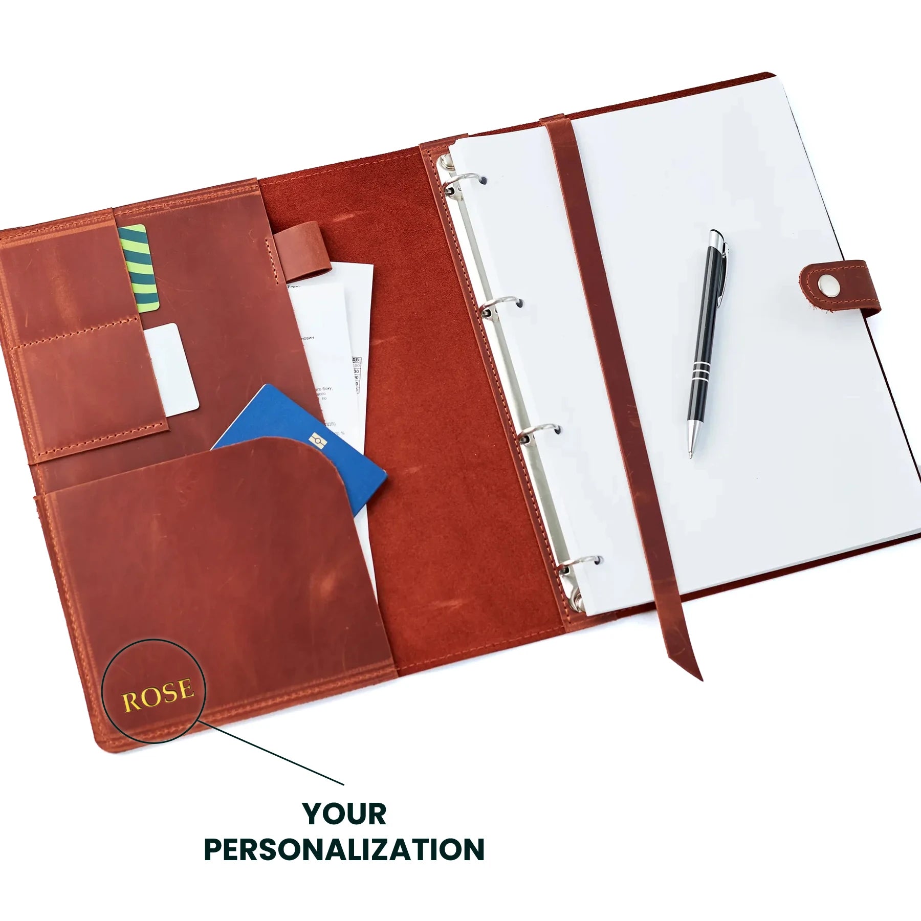A stylish and durable leather binder cover, designed for professionals, students, and organizers. Crafted from premium full-grain leather, this refillable cover accommodates various ring configurations and paper sizes, ensuring a perfect fit for your needs. Available in classic colors, it combines functionality and elegance for everyday use.