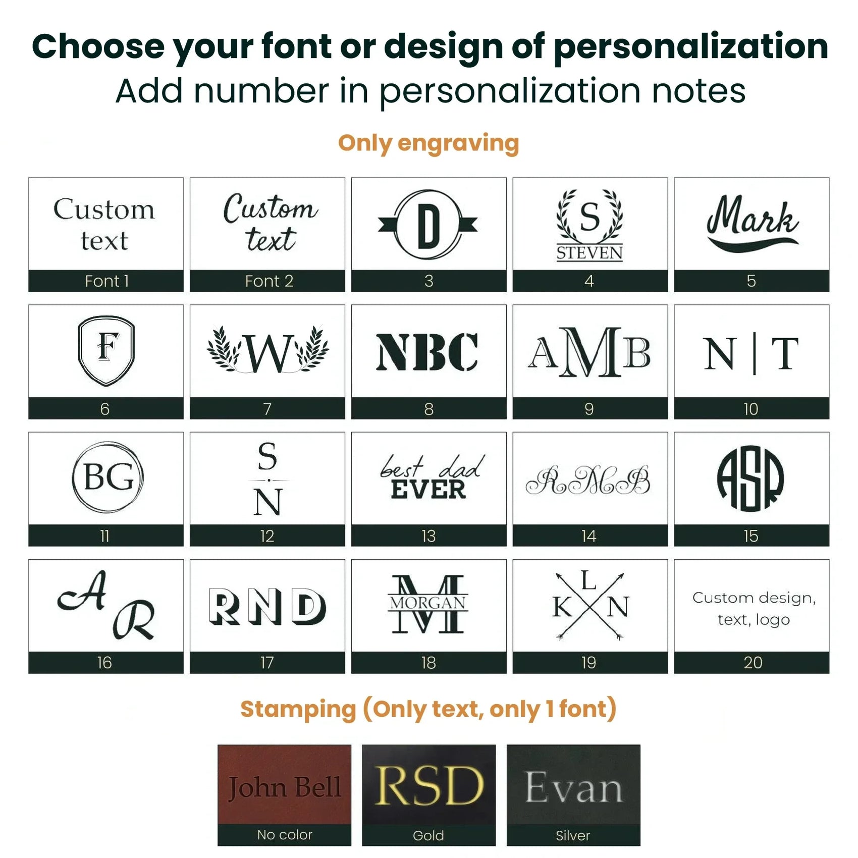 2. Stamping: debossed into leather by heated metal letter stamps. Best for initials, short word.