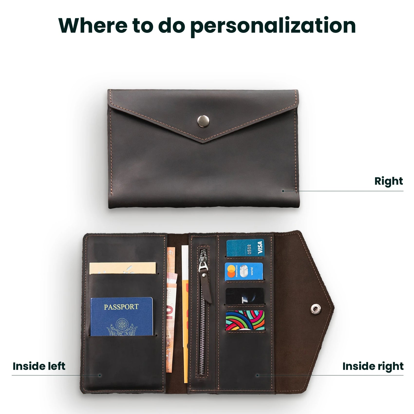 - Spacious interior to hold passports, tickets, cards, and currency.