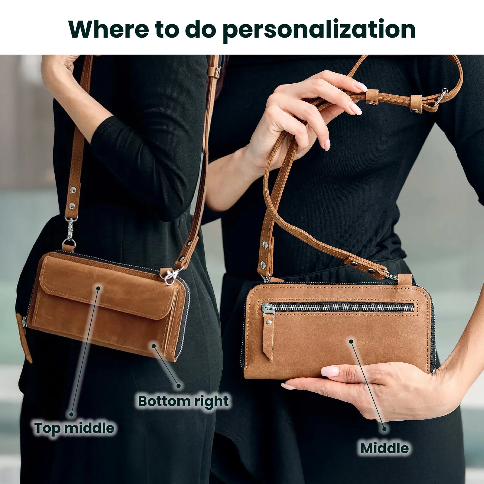 2. Stamping: debossed into leather by heated metal letter stamps. Best for initials, short word.